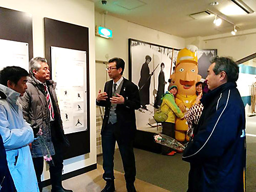生憎の天候でしたので、一本足スキーの実演は取り辞めとなりました。顕彰する会は陽気そうなレルヒ少佐の像が展示され、少佐にゆかりのある物品や歴代スキーの展示物に囲まれたスキー発生記念館で粛々と取り行われました。