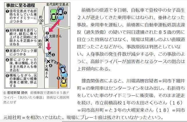 高齢運転者に認知の兆候があることに気づいた時点で、家族親族・近隣友人は勇気を持って本人に告げて自主返納を進めるとともに、これは国で一定の年齢制限を設ける法律を作るようにしていかなければなりません。自動車業界とタイアップした安全体制を作ることが必須です。