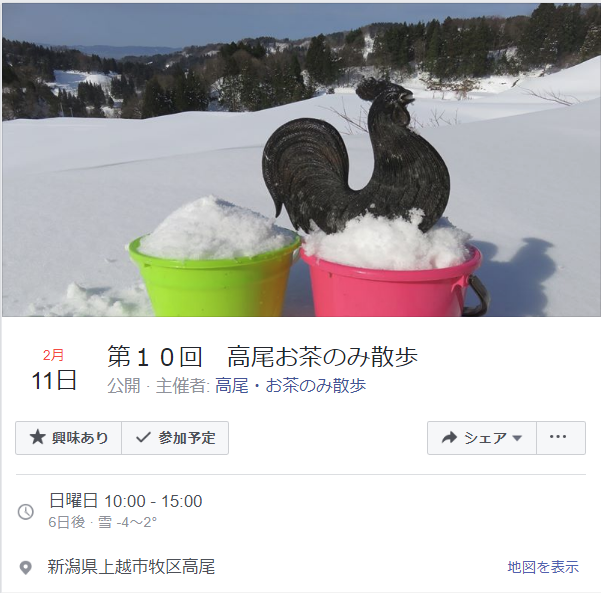 豪雪になりませんように、と毎日祈る2月ですが、今月もまたお茶のみ散歩の日が来ます。(2月11日 日曜日)