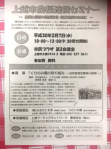 小布施で「くりのみ園」を経営される島津理事長から、今回も障害者自立支援への熱い思いを聞かせていただきました。現実問題を解決する、雇用を生む、経営して発展させる。 文字で言えば三行ですが、実践は汗水を流した苦しい過去10年だったと思います。情熱がなければ一歩も進めなかった事でしょう。上越市農福連携の未来への示唆になったと思います。