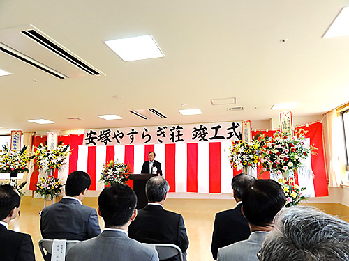 竣工式と言えば例のテープカットでお祝いするわけですが、この施設の完成とサービスの再開を待ち望んでおられた利用者の皆さんの喜びはひとしおでした。また今年は雪が特に深かったために、建設業者のチームの皆さんは除雪を繰り返しながらの工事だったそうです。何とか完成の日程を守ろうと昼夜努力されたと言う説明をされましたが、言葉少ないあいさつの中に物づくりに携わった業者さんらしい満足感や自信のようなものが感じられました。