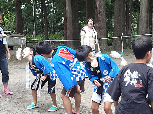 その後は小川国川の盆祭りに参加、子供たちがぱんくい競争や輪投げ、スイカ割りに興じました。またお招きを受けていた沖見地区の盆祭りにも参加、こちらではおいしい焼きそばをいただきました。