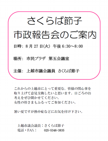 さくらば節子に御意見くださりたい方はぜひ市政報告会においで下さい。